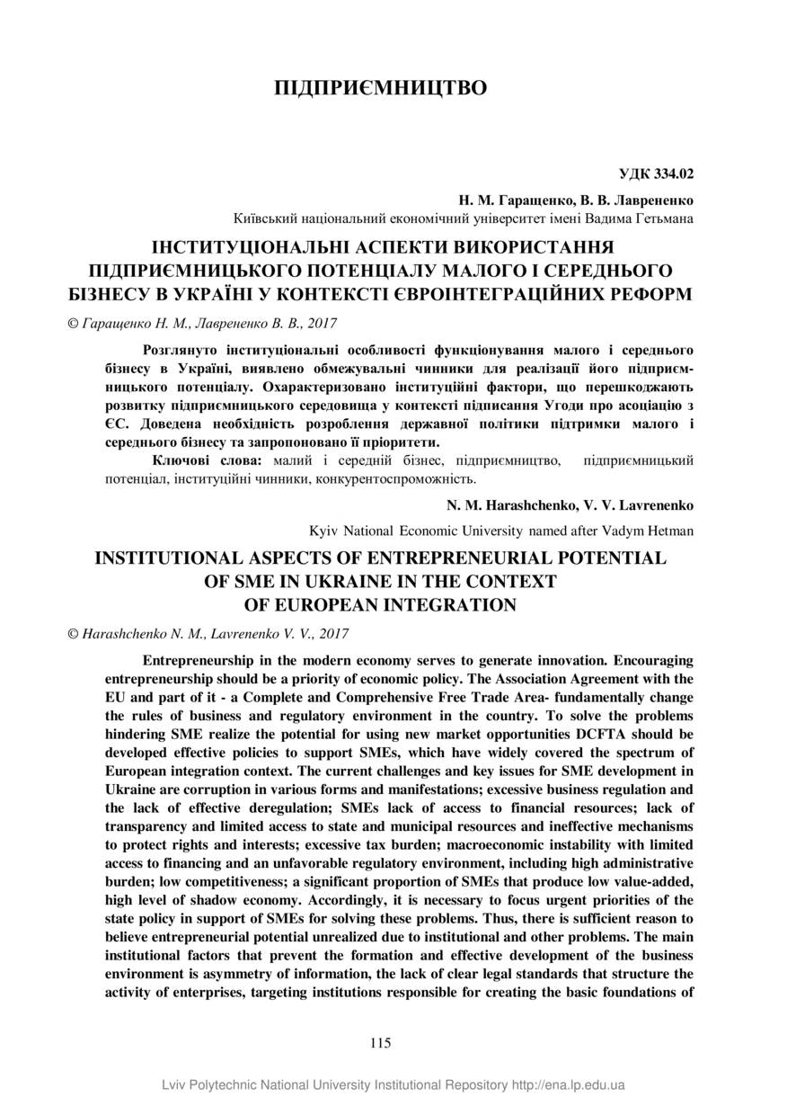 Гаращенко Н. М. Інституціональні аспекти використання підприємницького потенціалу малого і середнього бізнесу в Україні у контексті євроінтеграційних реформ / Н. М. Гаращенко, В. В. Лаврененко // Вісник Національного університету “Львівська політехніка”. Серія: Менеджмент та підприємництво в Україні: етапи становлення і проблеми розвитку. — Львів : Видавництво Львівської політехніки, 2017. — № 875. — С. 115–121. — (Підприємництво).