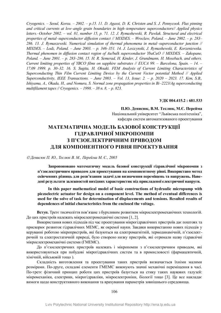Денисюк П. Ю. Математична модель базової конструкції гідравлічної мікропомпи з п’єзоелектричним приводом для компонентного рівня проектування / П. Ю. Денисюк, В. М. Теслюк, М. Є. Перейма // Вісник Національного університету “Львівська політехніка”. — Львів : Видавництво Національного університету “Львівська політехніка”, 2005. — № 548 : Комп’ютерні системи проектування. Теорія і практика. — С. 106–111.