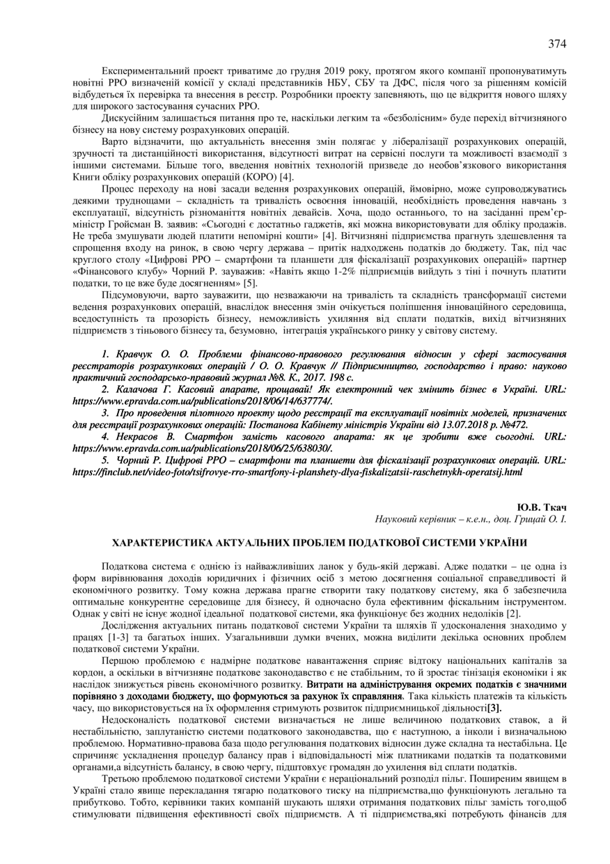 Ткач Ю. В. Характеристика актуальних проблем податкової системи України / Ю. В. Ткач, О. І. Грицай // 76-та Студентська науково-технічна конференція. Секція "Економіка і менеджмент" : збірник тез доповідей, жовтень – листопад 2018 року. — Львів : Видавництво Львівської політехніки, 2018. — С. 374–375. — (Бухгалтерський облік, аналіз та аудит).