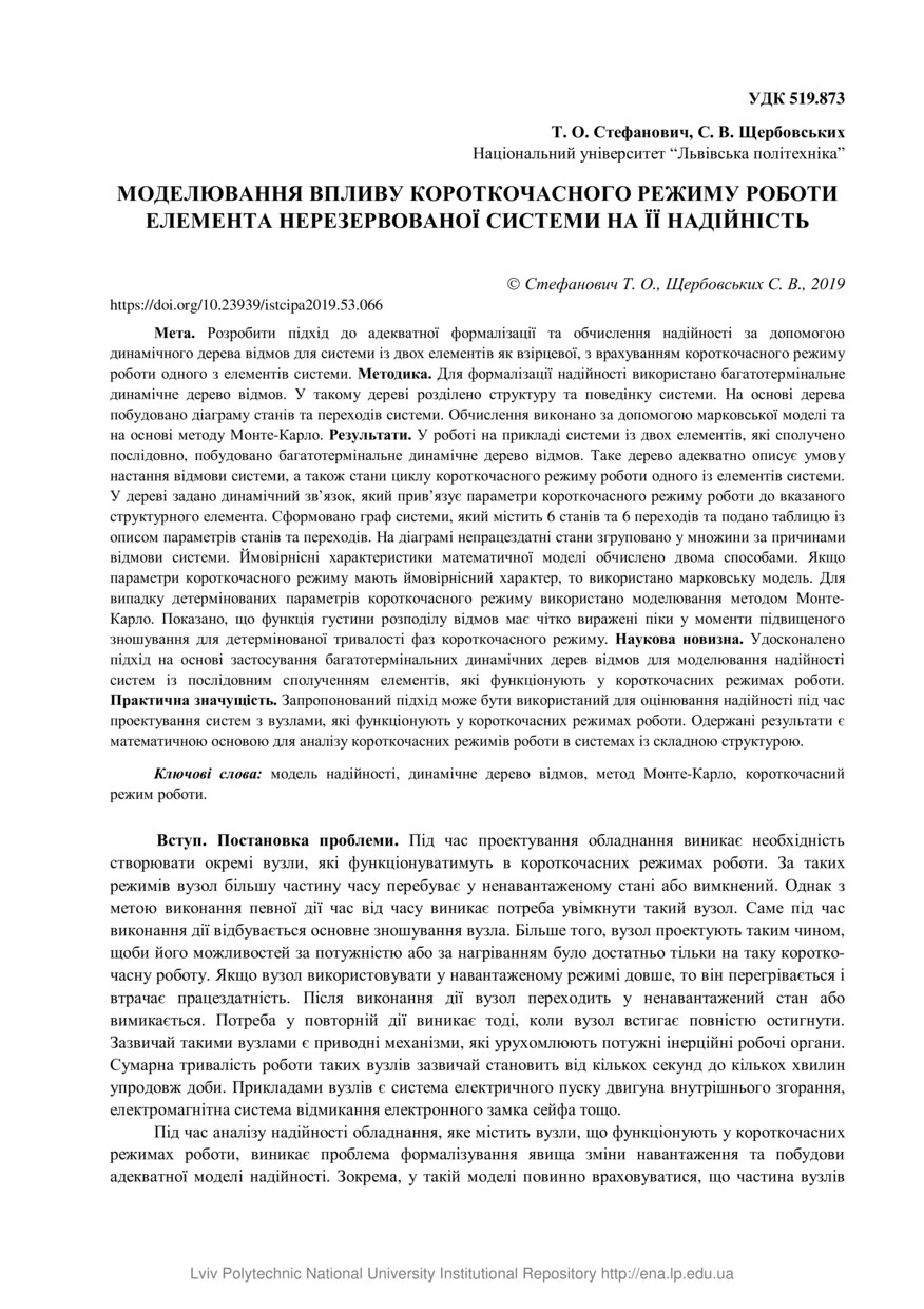 Стефанович Т. О. Моделювання впливу короткочасного режиму роботи елемента нерезервованої системи на її надійність / Т. О. Стефанович, С. В. Щербовських // Автоматизація виробничих процесів у машинобудуванні та приладобудуванні : український міжвідомчий науково-технічний збірник. — Львів : Видавництво Львівської політехніки, 2019. — Том 53. — С. 66–72.