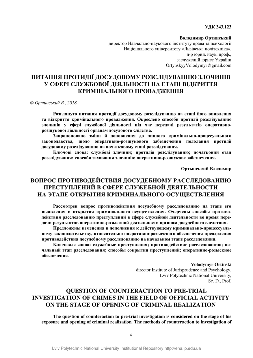 Ортинський В. Питання протидії досудовому розслідуванню злочинів у сфері службової діяльності на етапі відкриття кримінального провадження / Володимир Ортинський // Вісник Національного університету “Львівська політехніка”. Серія: Юридичні науки. — Львів : Видавництво Львівської політехніки, 2018. — № 902 (19). — С. 4–10.