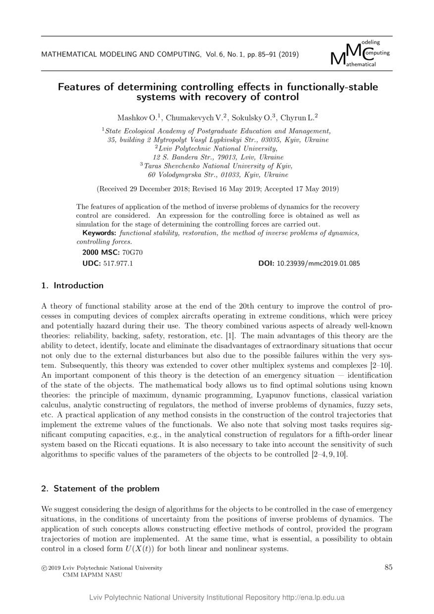 Features of determining controlling effects in functionally-stable systems with recovery of control / O. Mashkov, V. Chumakevych, O. Sokulsky, L. Chyrun // Mathematical Modeling and Computing. — Lviv : Lviv Politechnic Publishing House, 2019. — Vol 6. — No 1. — P. 85–91.