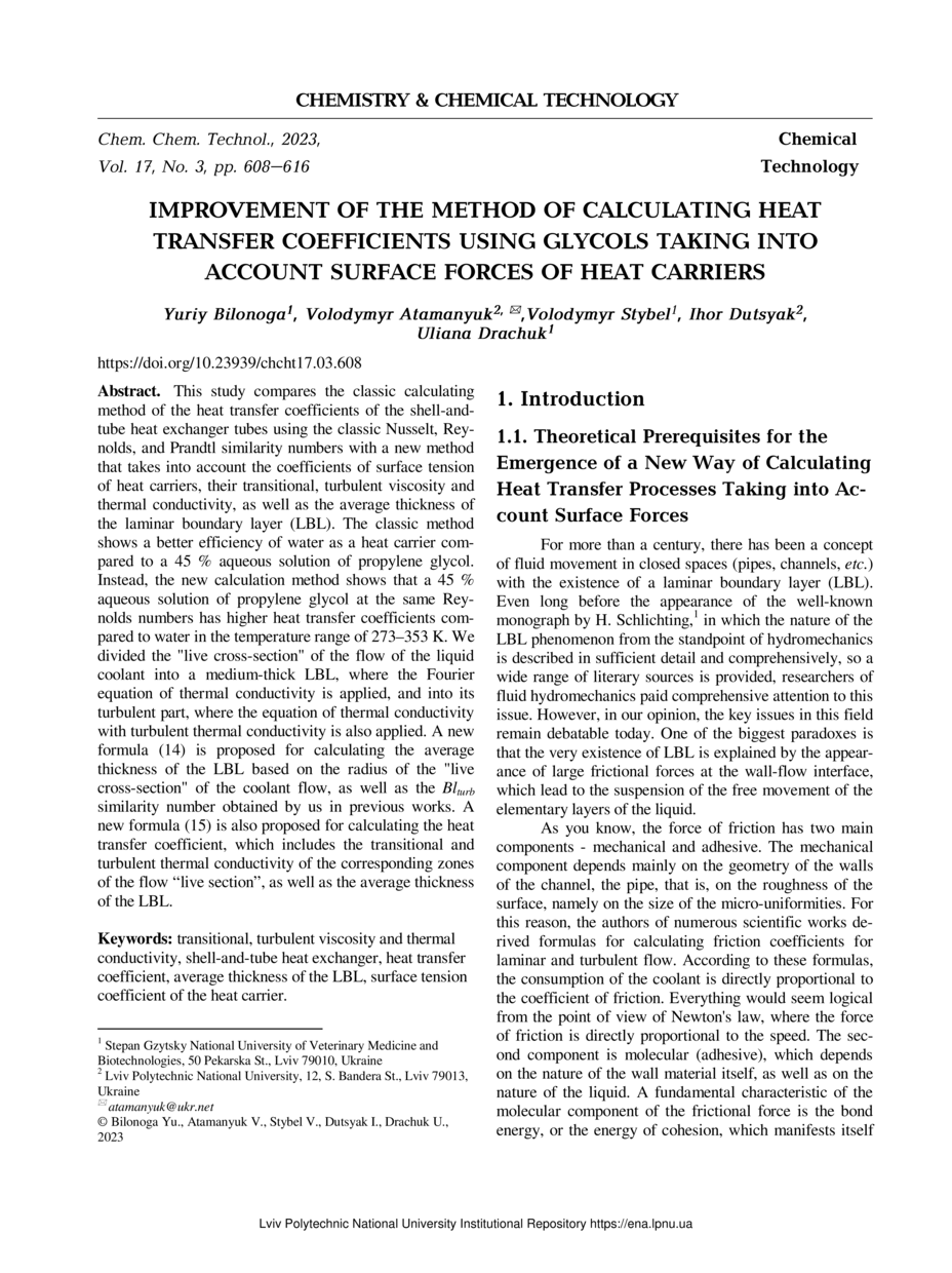 | dc.identifier.citationen | Improvement of the Method of Calculating Heat Transfer Coefficients Using Glycols Taking into Account Surface Forces of Heat Carriers / Yuriy Bilonoga, Volodymyr Atamanyuk, Volodymyr Stybel, Ihor Dutsyak, Uliana Drachuk // Chemistry & Chemical Technology. — Lviv : Lviv Politechnic Publishing House, 2023. — Vol 17. — No 3. — P. 608–616. | |
