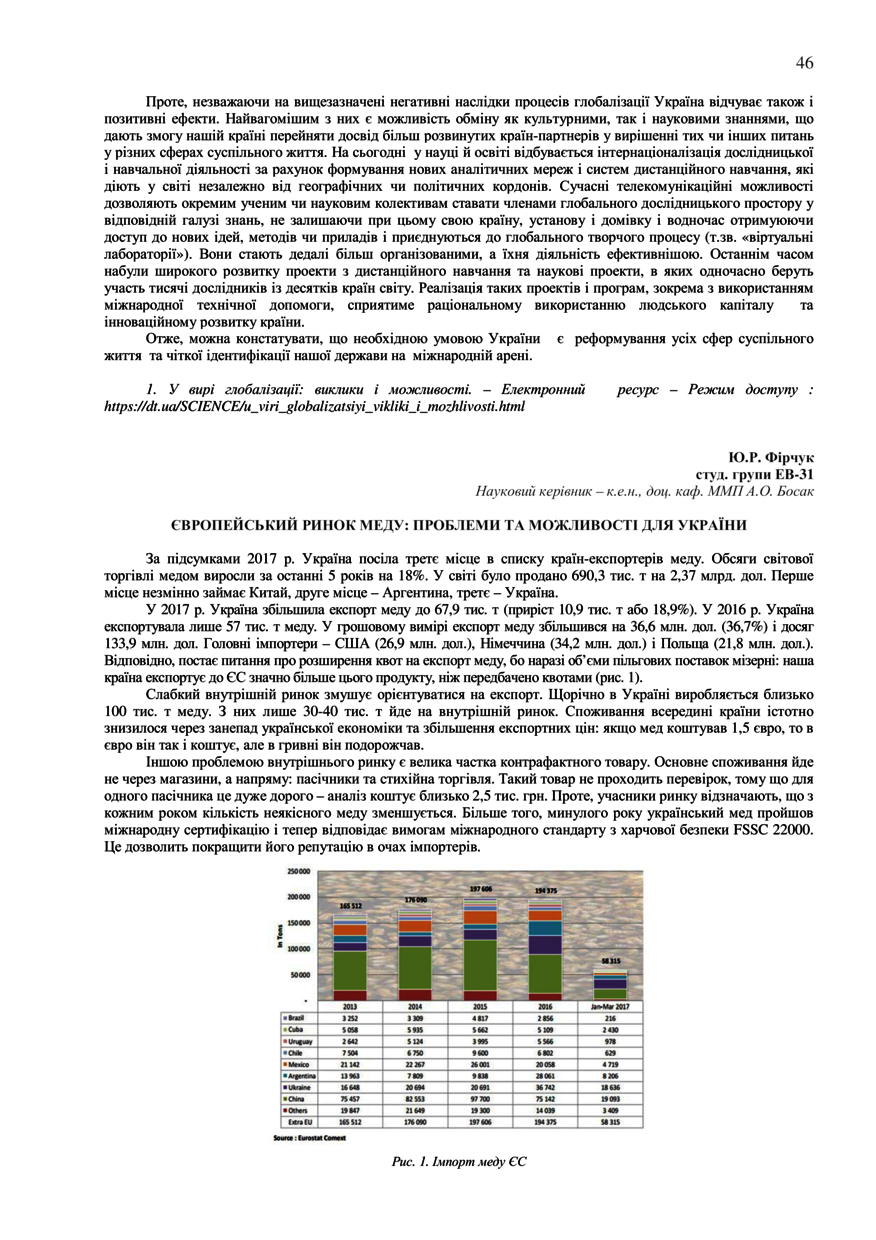 Фірчук Ю. Р. Європейський ринок меду: проблеми та можливості для України / Ю. Р. Фірчук, А. О. Босак // 76-та Студентська науково-технічна конференція. Секція "Економіка і менеджмент" : збірник тез доповідей, жовтень – листопад 2018 року. — Львів : Видавництво Львівської політехніки, 2018. — С. 46–47. — (Економіка експортно – імпортної та митної діяльності).