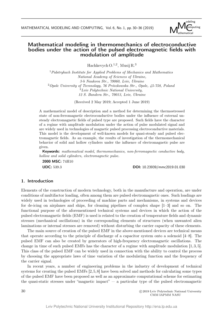 Hachkevych O. Mathematical modeling in thermomechanics of electroconductive bodies under the action of the pulsed electromagnetic fields with modulation of amplitude / O. Hachkevych, R. Musij // Mathematical Modeling and Computing. — Lviv : Lviv Politechnic Publishing House, 2019. — Vol 6. — No 1. — P. 30–36.