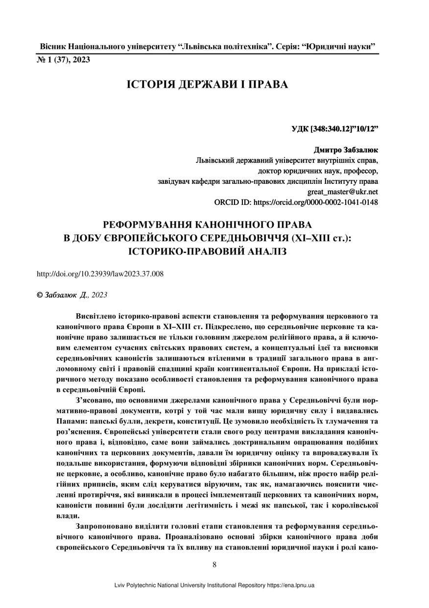 | dc.identifier.citation | Забзалюк Д. Реформування канонічного права в добу європейського середньовіччя (ХІ–ХІІІ ст.): історико-правовий аналіз / Дмитро Забзалюк // Вісник Національного університету “Львівська політехніка”. Серія: Юридичні науки. — Львів : Видавництво Львівської політехніки, 2023. — № 1(37). — С. 8–13. | |