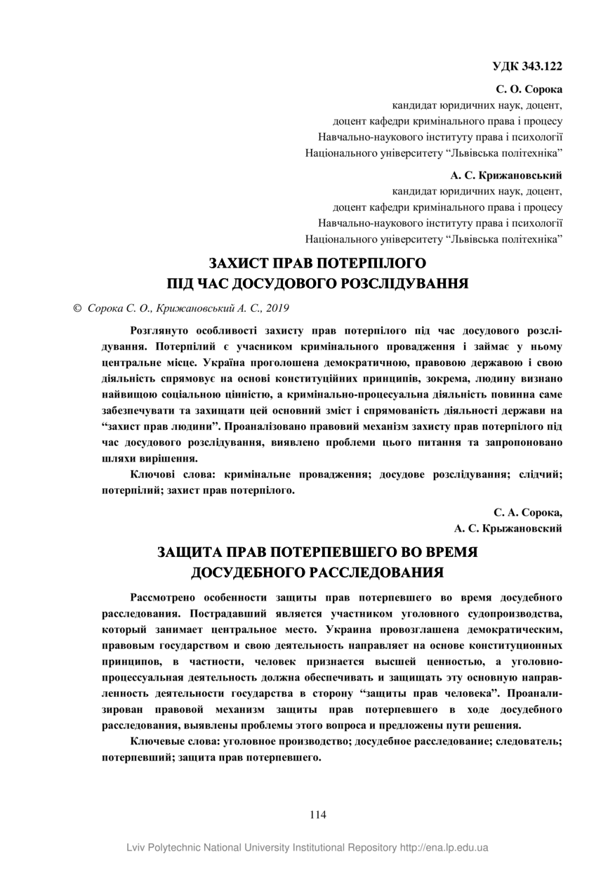 Сорока С. О. Захист прав потерпілого під час досудового розслідування / С. О. Сорока, А. С. Крижановський // Вісник Національного університету “Львівська політехніка”. Серія: Юридичні науки. — Львів : Видавництво Львівської політехніки, 2019. — № Випуск 23. — С. 114–121.