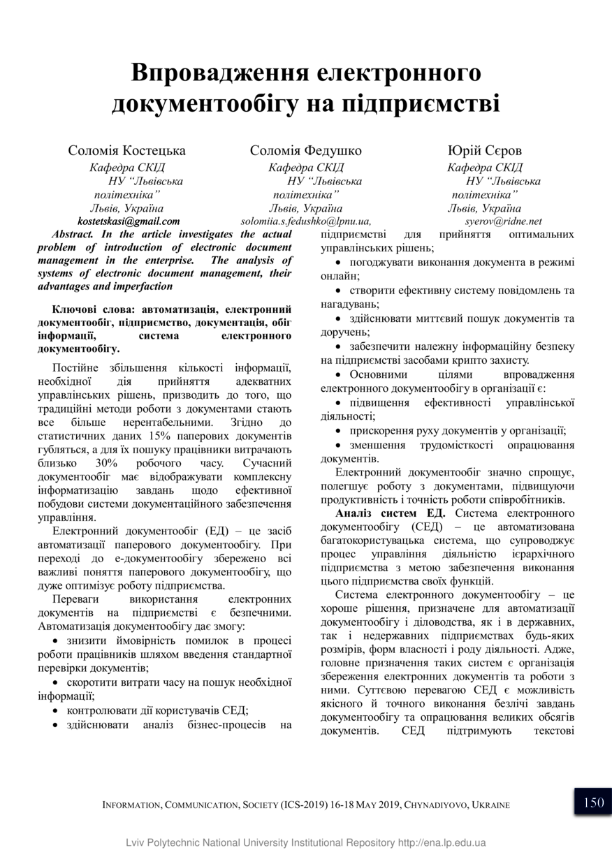 Костецька С. Впровадження електронного документообігу на підприємстві / Соломія Костецька, Соломія Федушко, Юрій Сєров // Інформація, комунікація, суспільство 2019 : матеріали 8-ої Міжнародної наукової конференції ІКС-2019, 16-18 травня 2019 року, Чинадієво. — Львів : Видавництво Львівської політехніки, 2019. — С. 150–151. — (Документознавство та інформаційна діяльність у системі сучасних наукових досліджень).