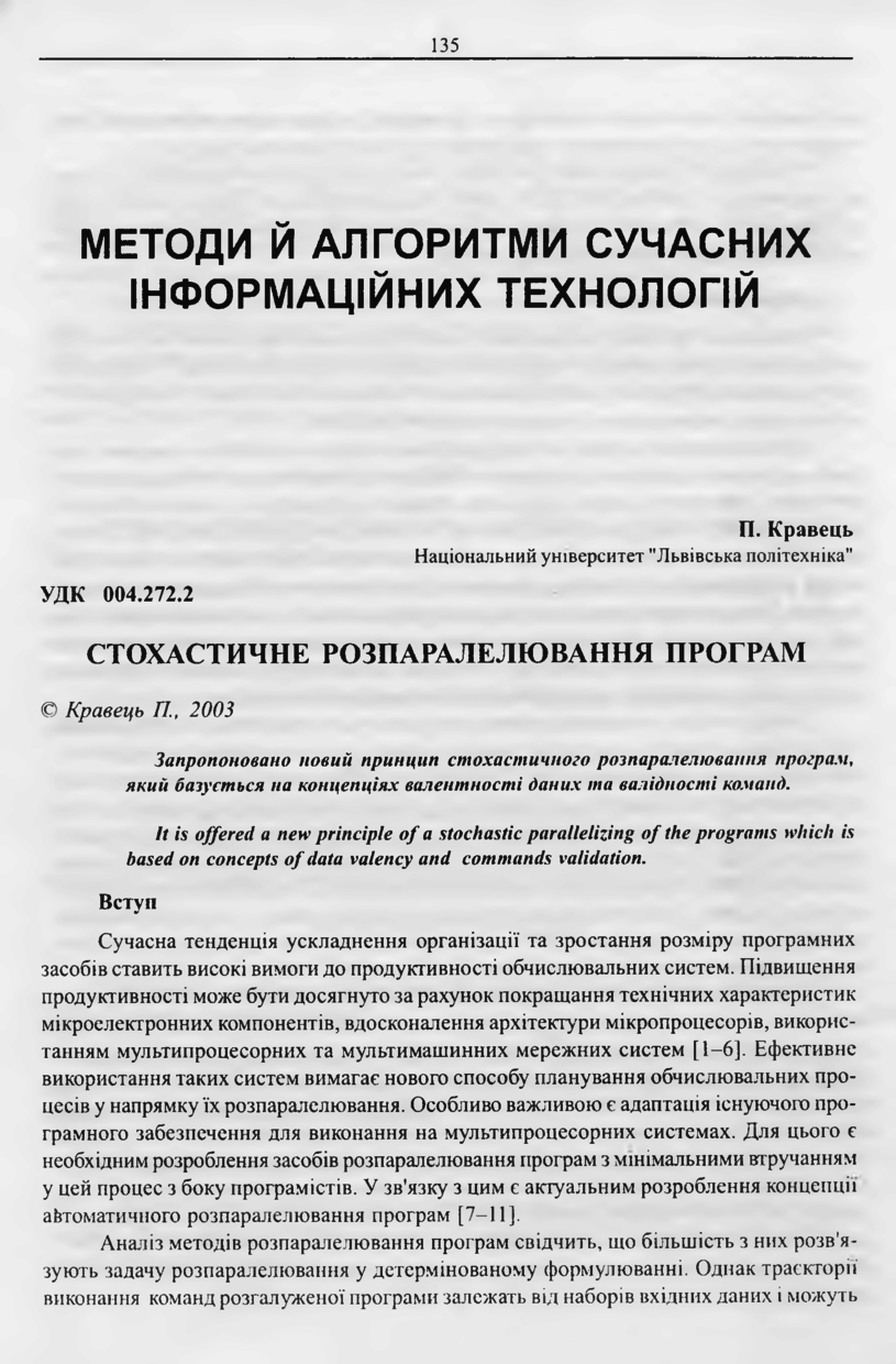 Кравець П. Стохастичне розпаралелювання програм / П. Кравець // Вісник Національного університету “Львівська політехніка”. — Львів : Видавництво Національного університету “Львівська політехніка”, 2003. — № 496 : Комп'ютерна інженерія та інформаційні технології. — С. 135–145. — (Методи й алгоритми сучасних інформаційних технологій).
