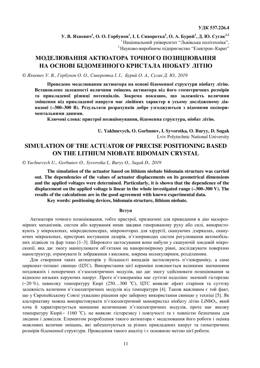 Моделювання актюатора точного позиціювання на основі бідоменного кристала ніобату літію / У. В. Яхневич, О. О. Горбунов, І. І. Сиворотка, О. А. Бурий, Д. Ю. Сугак // Вісник Національного університету “Львівська політехніка”. Серія: Радіоелектроніка та телекомунікації. — Львів : Видавництво Львівської політехніки, 2019. — № 914. — С. 11–16.