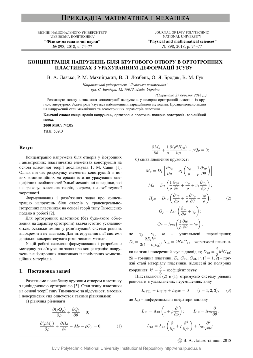 | dc.identifier.citationen | Concentration of stresses around a round hole in orthotropic plates with allowance for shear deformation / V. A. Lazko, R. M. Makhnitskyi, V. L. Lozben, O. Ya. Brodyak, V. M. Huk // Visnyk Natsionalnoho universytetu "Lvivska politekhnika". Serie: Fizyko-matematychni nauky. — Vydavnytstvo Lvivskoi politekhniky, 2018. — No 898. — P. 74–77. — (Prykladna matematyka i mekhanika). | |