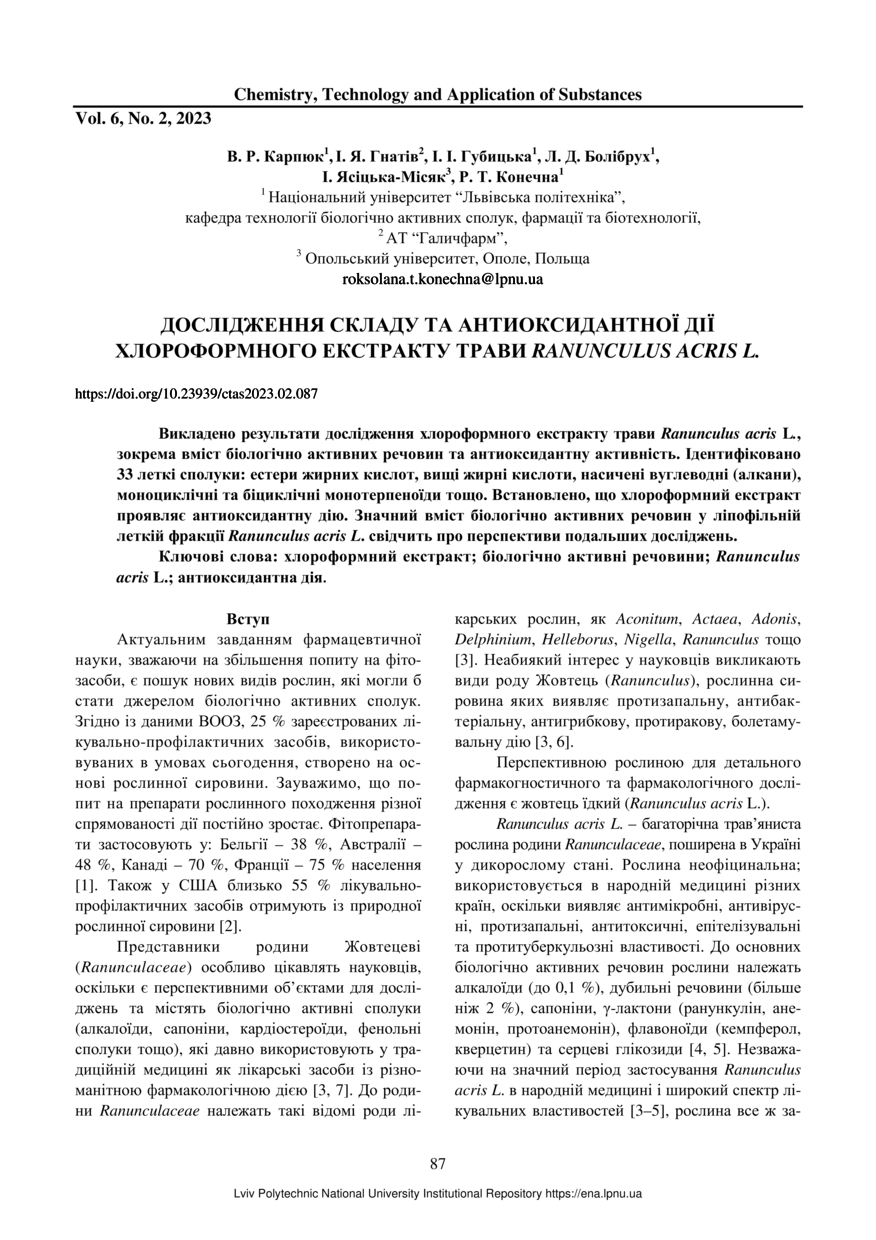 Дослідження складу та антиоксидантної дії хлороформного екстракту трави Ranunculus Acris L. / В. Р. Карпюк, І. Я. Гнатів, І. І. Губицька, Л. Д. Болібрух, І. Ясіцька-Місяк, Р. Т. Конечна // Chemistry, Technology and Application of Substances. — Lviv : Lviv Politechnic Publishing House, 2023. — Том 6. — № 2. — С. 87–92.