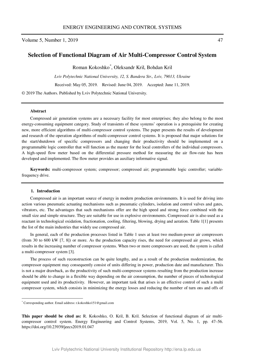 Kokoshko R. Selection of Functional Diagram of Air Multi-Compressor Control System / Roman Kokoshko, Oleksandr Kril, Bohdan Kril // Energy engineering and control systems. — Львів : Lviv Politechnic Publishing House, 2019. — Vol 5. — No 1. — P. 47–56.