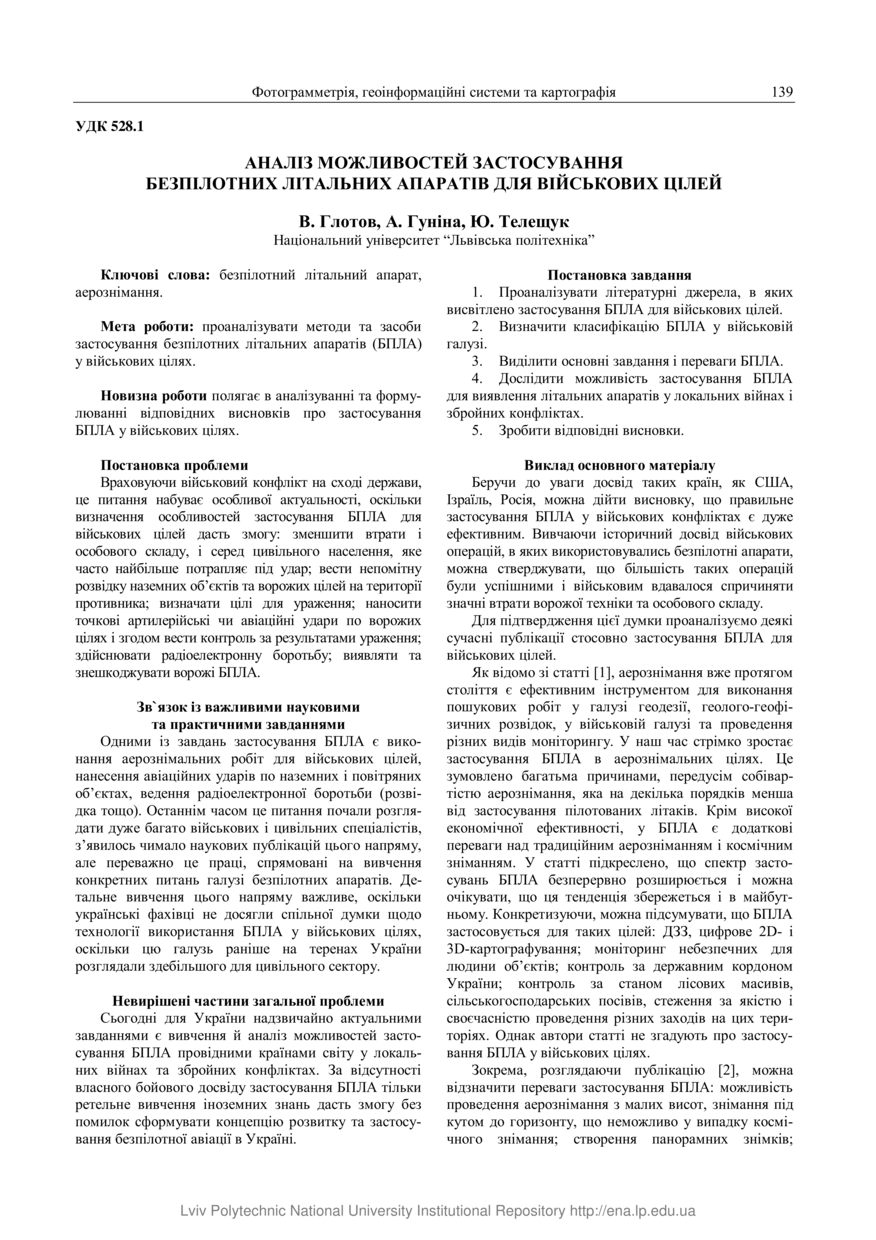 Глотов В. Аналіз можливостей застосування безпілотних літальних апаратів для військових цілей / В. Глотов, А. Гуніна, Ю. Телещук // Сучасні досягнення геодезичної науки та виробництва. — Львів, 2017. — Том 1 (33). — С. 139–146.