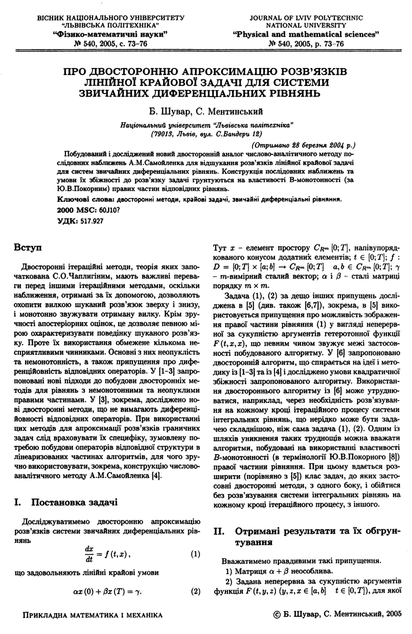 Шувар Б. Про двосторонню апроксимацію розв’язків лінійної крайової задачі для системи звичайних диференціальних рівнянь / Б. Шувар, С. Ментинський // Вісник Національного університету “Львівська політехніка”. — Львів : Видавництво Національного університету “Львівська політехніка”, 2005. — № 540 : Фізико-математичні науки. — С. 73–76. — (Прикладна математика і механіка).