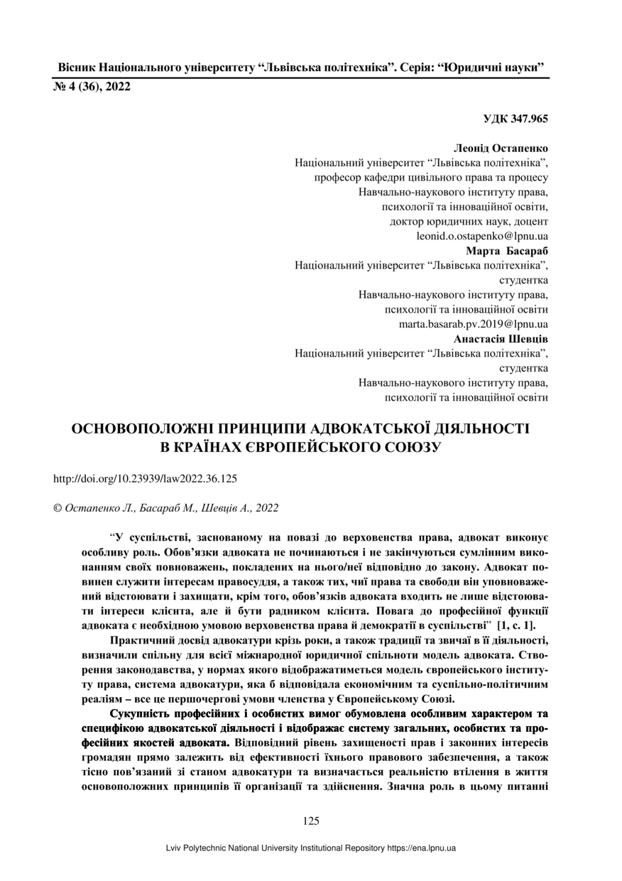 Остапенко Л. Основоположні принципи адвокатської діяльності в країнах Європейського Союзу / Леонід Остапенко, Марта Басараб, Анастасія Шевців // Вісник Національного університету “Львівська політехніка”. Серія: Юридичні науки. — Львів : Видавництво Львівської політехніки, 2022. — № 4 (36). — С. 125–130.