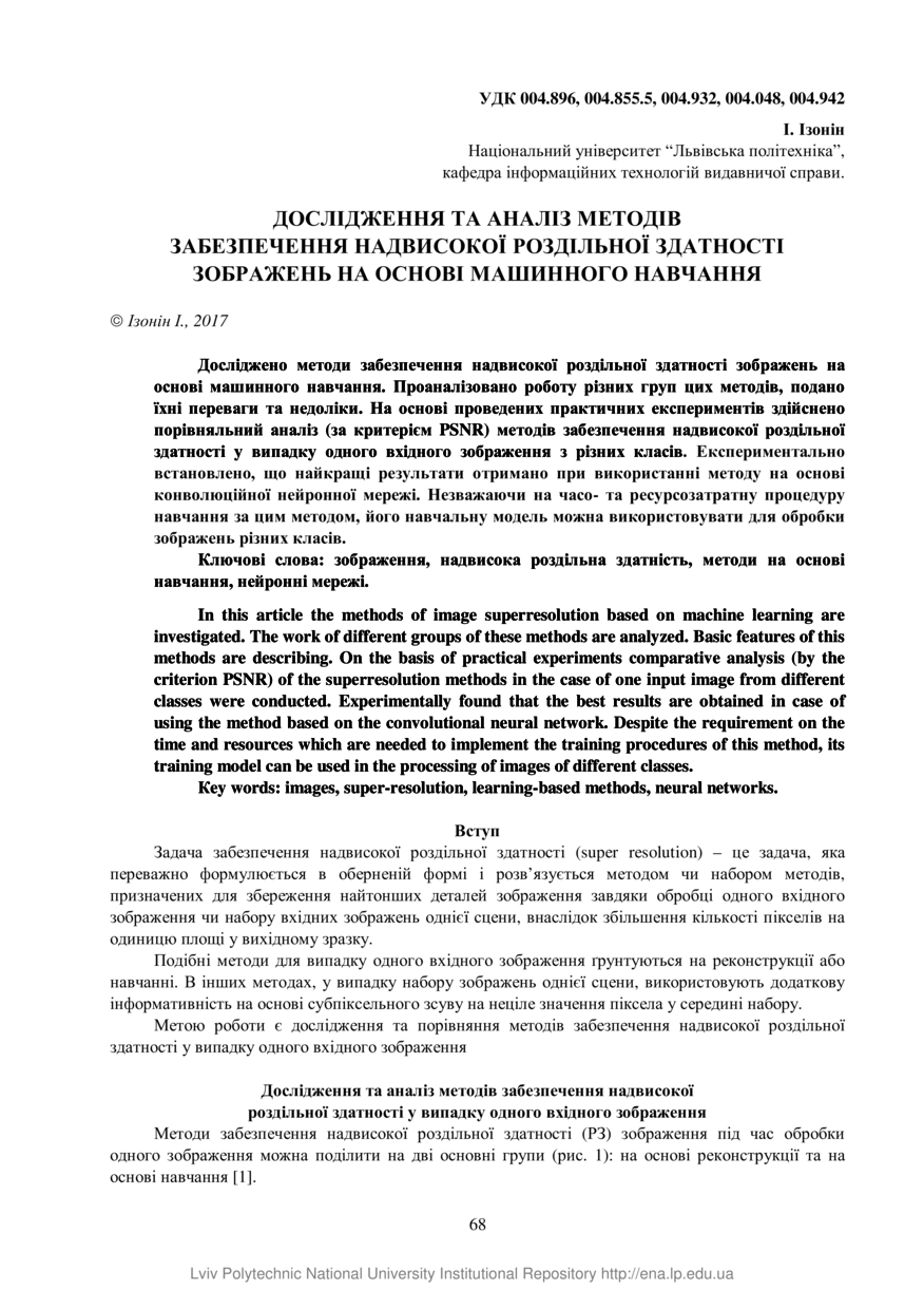 Ізонін І. Дослідження та аналіз методів забезпечення надвисокої роздільної здатності зображень на основі машинного навчання / І. Ізонін // Вісник Національного університету «Львівська політехніка». Серія: Комп’ютерні науки та інформаційні технології. — Львів : Видавництво Львівської політехніки, 2017. — № 864. — С. 68–76.
