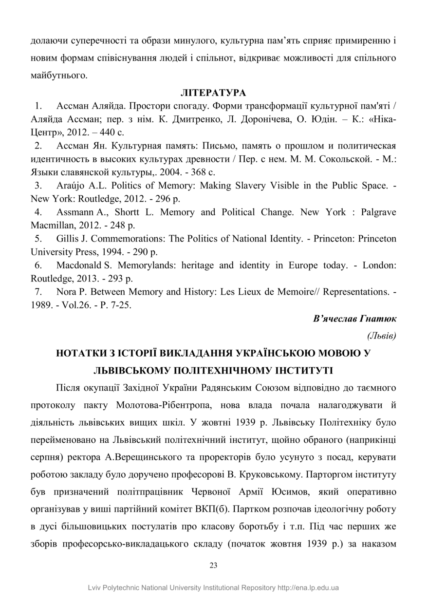 Гнатюк В. Нотатки з історії викладання українською мовою у Львівському політехнічному інституті / В’ячеслав Гнатюк // Історико-культурна спадщина: європейський вимір : тези Всеукраїнської науково-практичної конференції, 1 червня, 2018 року, Львів. — Львів : Інтерпрінт, 2018. — С. 23–28.