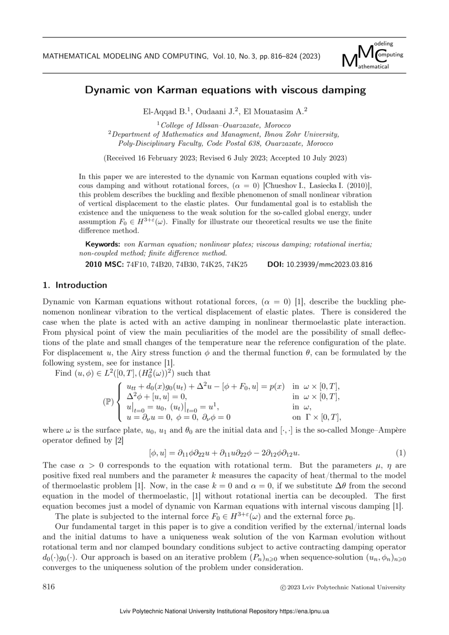El-Aqqad B. Dynamic von Karman equations with viscous damping / B. El-Aqqad, J. Oudaani, A. El Mouatasim // Mathematical Modeling and Computing. — Lviv : Lviv Politechnic Publishing House, 2023. — Vol 10. — No 3. — P. 816–824.