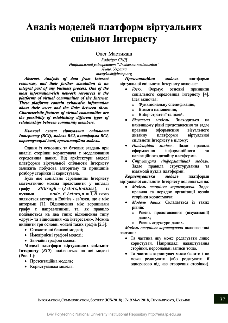 | dc.title | Аналіз моделей платформ віртуальних спільнот Інтернету | |
