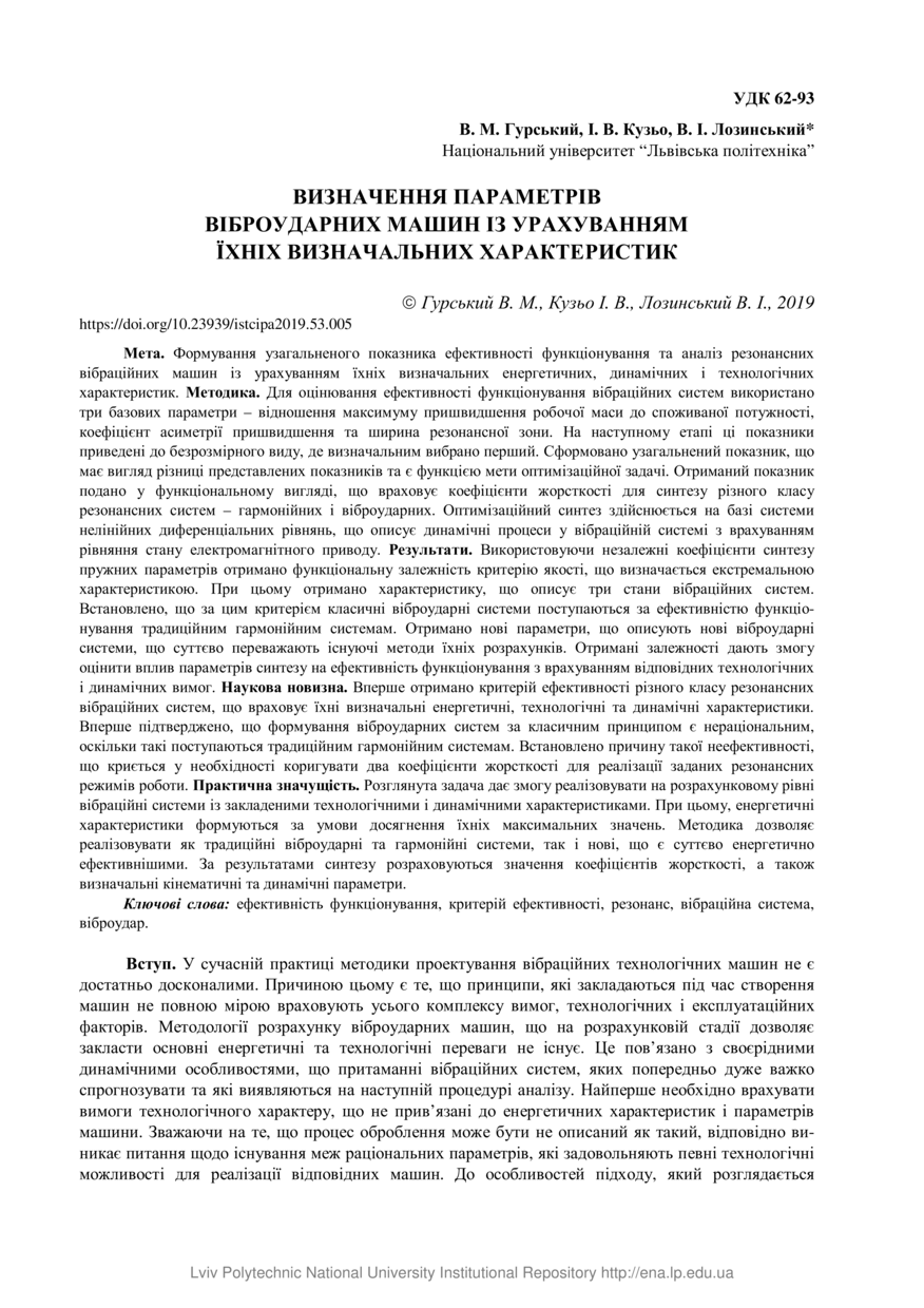 Гурський В. М. Визначення параметрів віброударних машин із урахуванням їхніх визначальних характеристик / В. М. Гурський, І. В. Кузьо, В. І. Лозинський // Автоматизація виробничих процесів у машинобудуванні та приладобудуванні : український міжвідомчий науково-технічний збірник. — Львів : Видавництво Львівської політехніки, 2019. — Том 53. — С. 5–12.