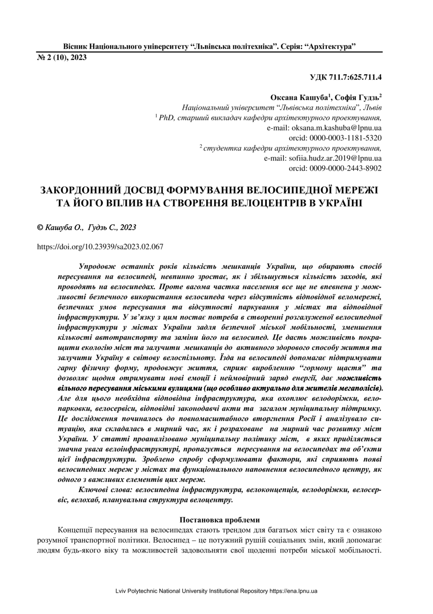 | dc.identifier.citation | Кашуба О. Закордонний досвід формування велосипедної мережі та його вплив на створення велоцентрів в Україні / Оксана Кашуба, Софія Гудзь // Вісник Національного університету "Львівська політехніка". Серія: Архітектура. — Львів : Видавництво Львівської політехніки, 2023. — № 5 (2). — С. 67–76. | |