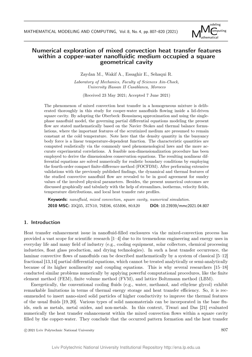 | dc.relation.references | [3] Jamesahar E., Sabour M., Shahabadi M., Mehryan S. A. M., Ghalambaz M. Mixed convection heat transfer by nanofluids in a cavity with two oscillating flexible fins: A fluid-structure interaction approach. Applied Mathematical Modelling. 82, 72–90 (2020). | |