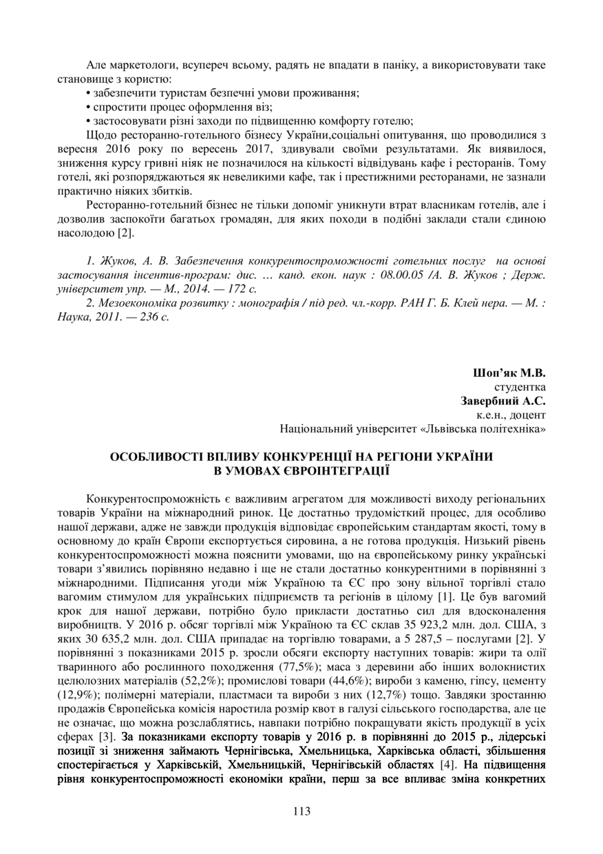 Шоп’як М. В. Особливості впливу конкуренції на регіони України в умовах євроінтеграції / М. В. Шоп’як, А. С. Завербний // Економічний розвиток держави, регіонів і підприємств: проблеми та перспективи : матеріали ІІ Міжнародної науково-практичної конференції молодих учених, 18–19 травня 2017 року, Львів. — Львів : Видавництво Львівської політехніки, 2017. — С. 113–114. — (Вплив зовнішніх і внутрішніх чинників на економічний розвиток регіонів).
