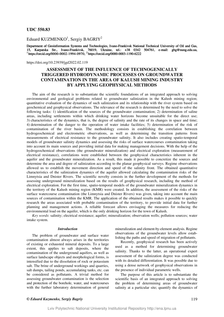 Kuzmenko E. Assessment of the influence of technogenically triggered hydrodynamic processes on groundwater contamination in the area of Kalush mining industry by applying geophysical methods / Eduard Kuzmenko, Sergiy Bagriy // Geodynamics. — Lviv : Lviv Politechnic Publishing House, 2022. — No 1(32). — P. 119–135.