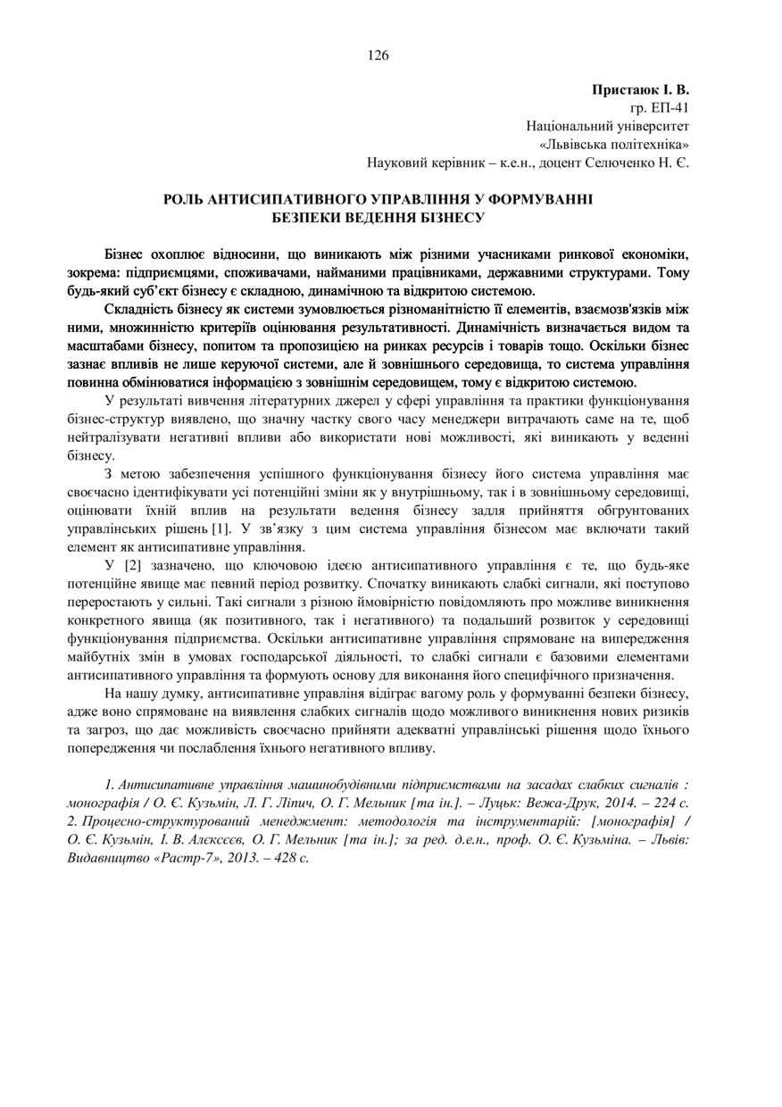 Роль антисипативного управління у формуванні безпеки ведення бізнесу