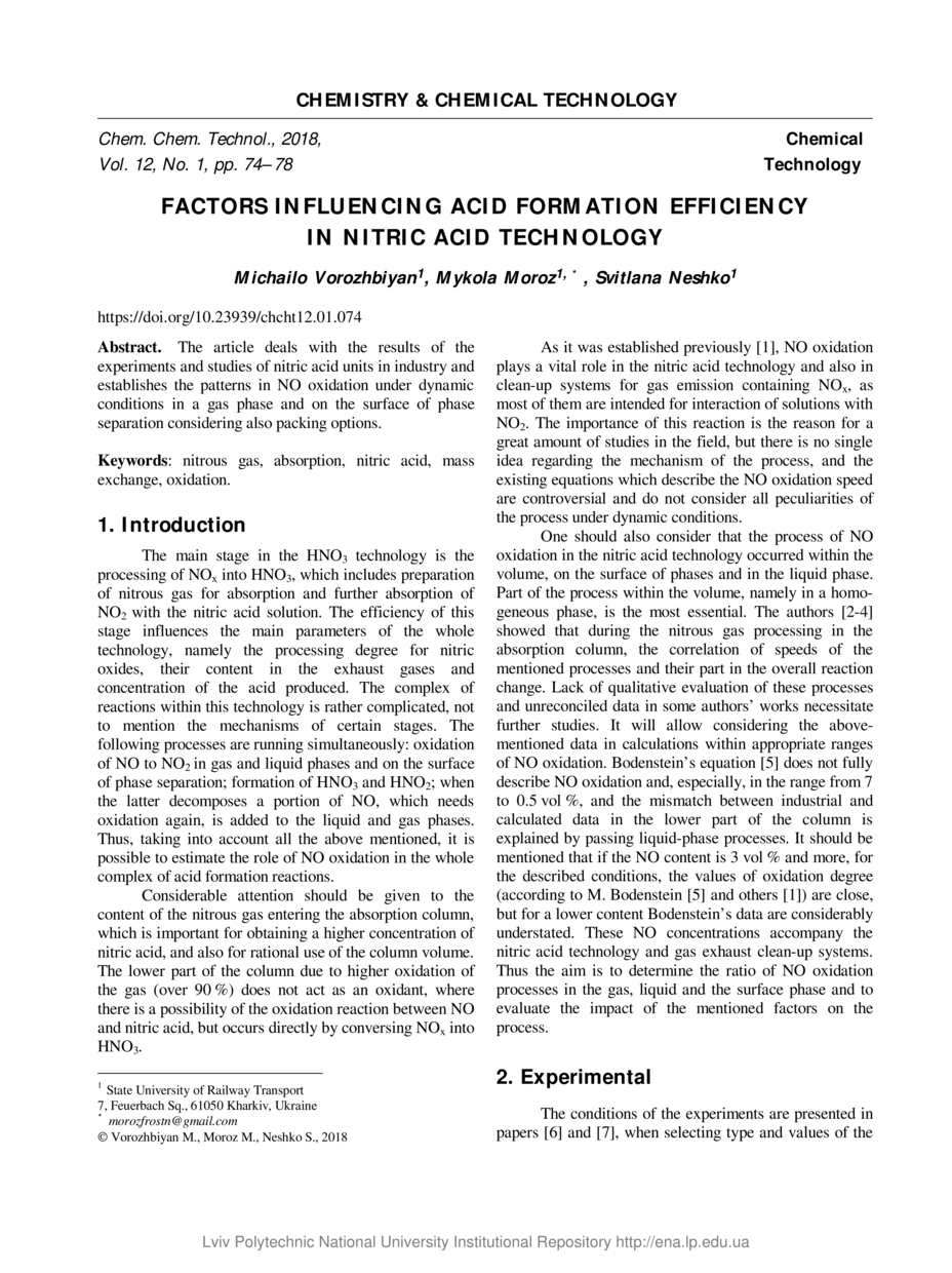 Vorozhbiyan M. Factors influencing acid formation efficiency in nitric acid technology / Michailo Vorozhbiyan, Mykola Moroz, Svitlana Neshko // Chemistry & Chemical Technology. — Lviv : Lviv Politechnic Publishing House, 2-18. — Vol 12. — No 1. — P. 74–78.