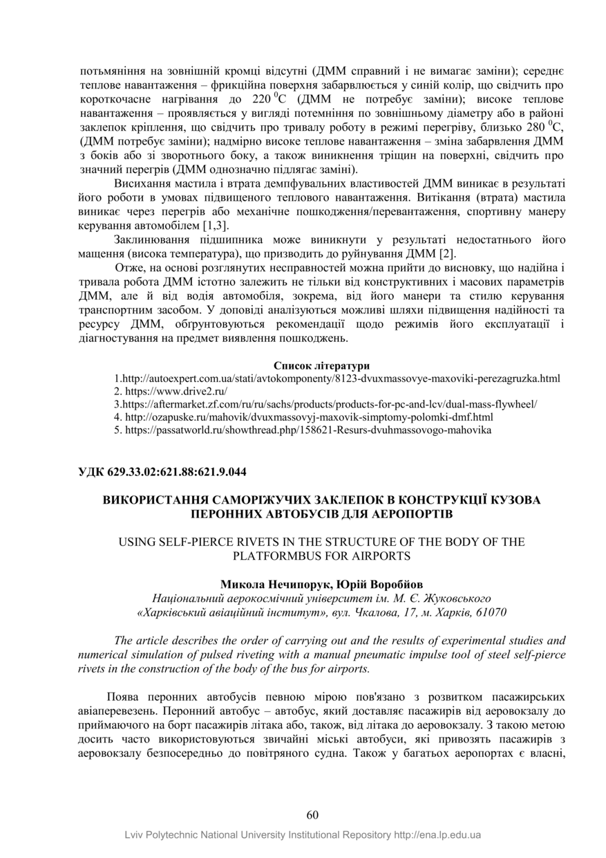 Нечипорук М. Використання саморіжучих заклепок в конструкції кузова перонних автобусів для аеропортів / Микола Нечипорук, Юрій Воробйов // Автобусобудування та пасажирські перевезення в Україні : тези доповідей III-ої Всеукраїнської науково-практичної конференції, Львів, 22-23 лютого 2018 року. — Львів : Видавництво Львівської політехніки, 2018. — С. 60–64. — (Автобусо- та автомобілебудування).