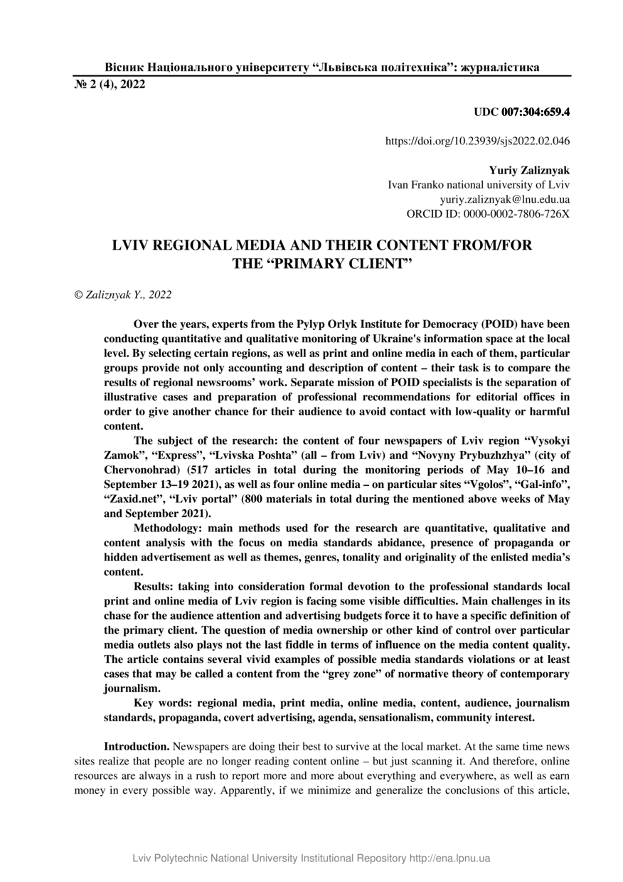 Zaliznyak Y. Lviv regional media and their content from/for the “Primary client” / Yuriy Zaliznyak // Bulletin of Lviv Polytechnic National University: journalism. — Lviv : Lviv Politechnic Publishing House, 2022. — Vol 2 (4). — P. 46–54.