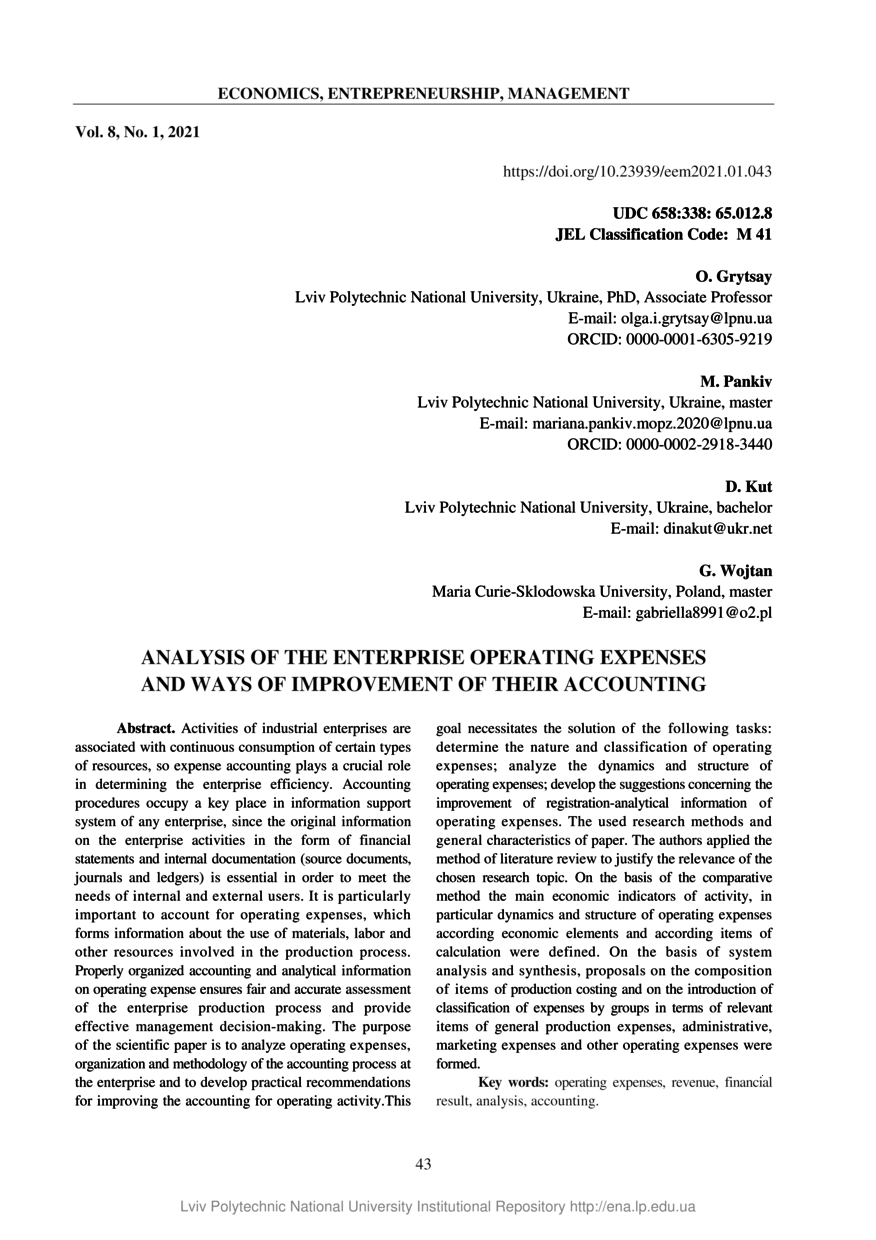 | dc.identifier.citation | Analysis of the enterprise operating expenses and ways of improvement of their accounting / O. Grytsay, M. Pankiv, D. Kut, G. Wojtan // Economics, Entrepreneurship, Management. — Lviv : Lviv Politechnic Publishing House, 2021. — Vol 8. — No 1. — P. 43–58. | |