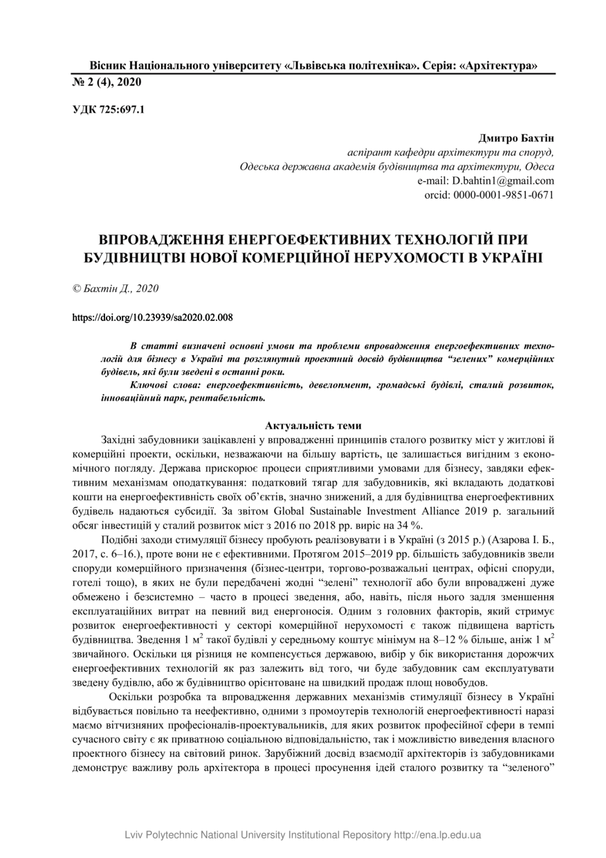 | dc.identifier.citation | Бахтін Д. Впровадження енергоефективних технологій при будівництві нової комерційної нерухомості в Україні / Дмитро Бахтін // Вісник Національного університету “Львівська політехніка”. Серія: Архітектура. — Львів : Видавництво Львівської політехніки, 2020. — Том 2. — № 4. — С. 8–18. | |