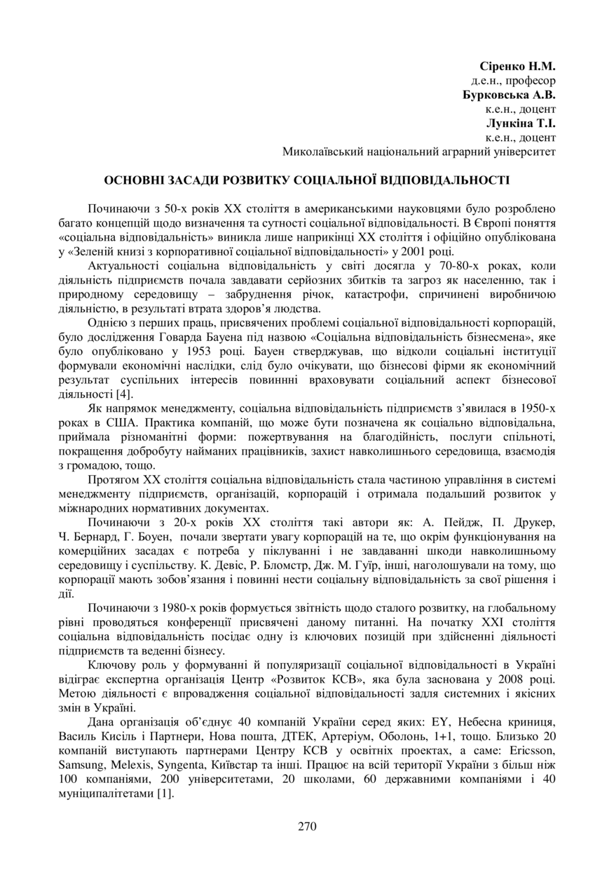 Сіренко Н. М. Основні засади розвитку соціальної відповідальності / Н. М. Сіренко, А. В. Бурковська, Т. І. Лункіна // Економічний розвиток держави, регіонів і підприємств: проблеми та перспективи : матеріали ІІ Міжнародної науково-практичної конференції молодих учених, 18–19 травня 2017 року, Львів. — Львів : Видавництво Львівської політехніки, 2017. — С. 270–271. — (Збалансований розвиток економіки України: соціально-правовий, екологічний та інші аспекти).