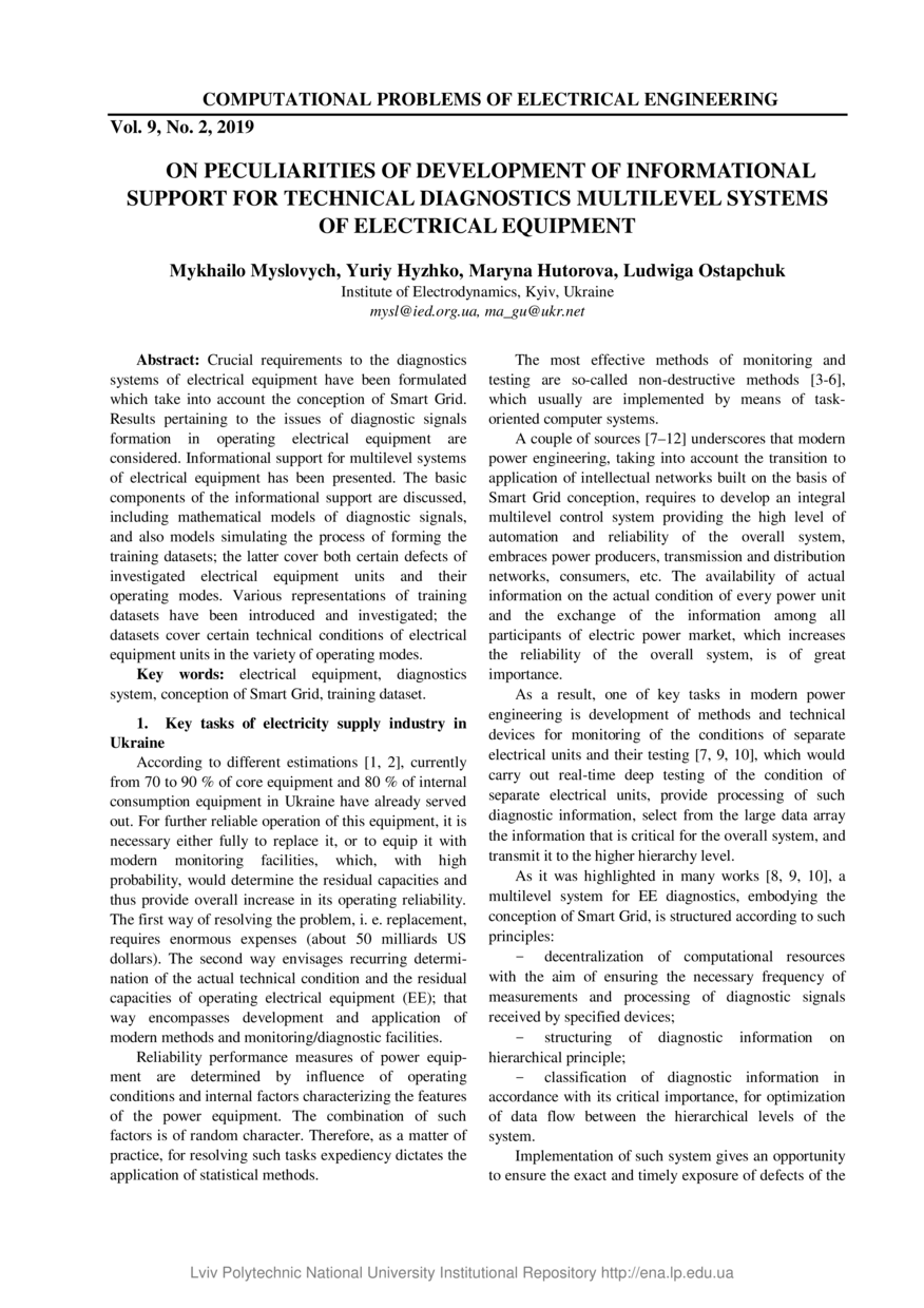 On Peculiarities of development of information support for technical diagnostics multilevel systems of electrical equipment / Mykhailo Myslovych, Yuriy Hyzhko, Maryna Hutorova, Liudviga Ostapchuk // Computational Problems of Electrical Engineering. — Lviv : Lviv Politechnic Publishing House, 2019. — Vol 9. — No 2. — P. 34–41.