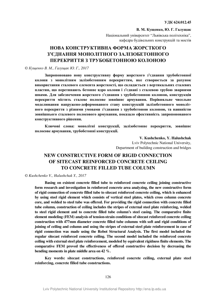 | dc.title | Нова конструктивна форма жорсткого з’єднання монолітного залізобетонного перекриття з трубобетонною колоною | |
