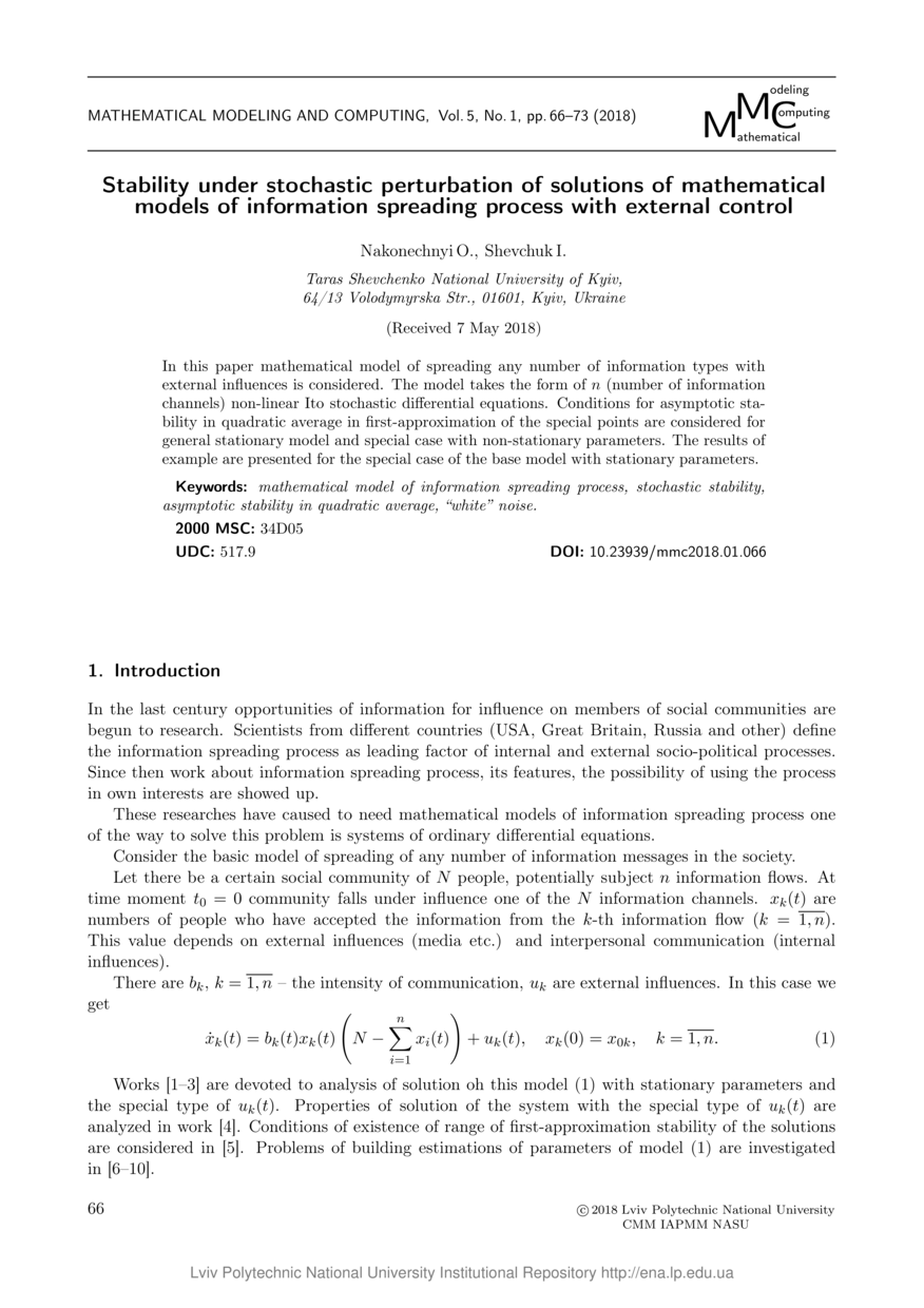 | dc.title.alternative | Стійкість під час стохастичних збурень розв’язків у математичних моделях розповсюдження інформації зі зовнішніми впливами | |
