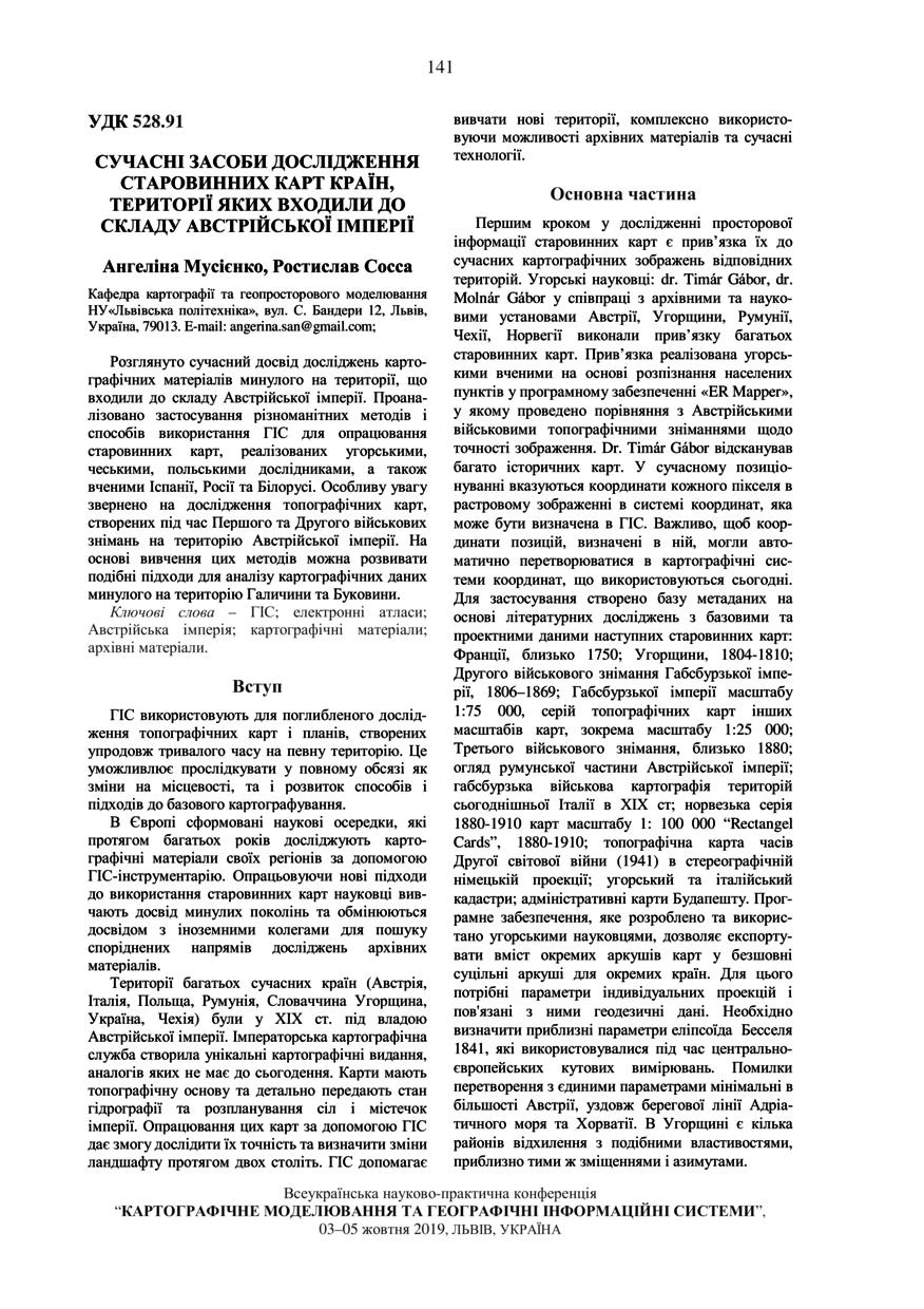 Мусієнко А. Сучасні засоби дослідження старовинних карт країн, території яких входили до складу Австрійської імперії / Ангеліна Мусієнко, Ростислав Сосса // Картографічне моделювання та географічні інформаційні системи : збірник матеріалів всеукраїнської науково-практичної конференції, 3–5 жовтня 2019 року, Львів. — Львів : Видавництво Львівської політехніки, 2019. — С. 141–144.