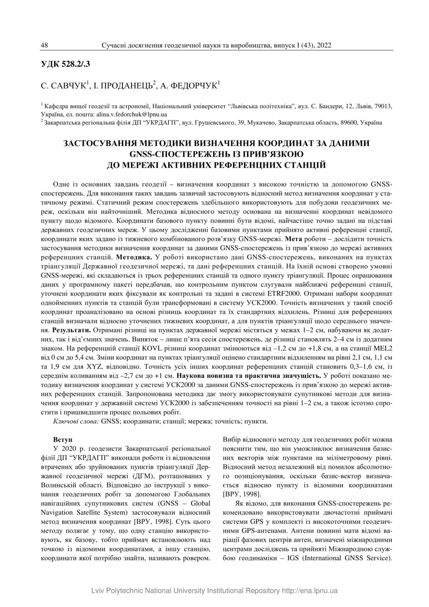 Савчук С. Застосування методики визначення координат за даними GNSS-спостережень із прив’язкою до мережі активних референцних станцій / С. Савчук, І. Проданець, А. Федорчук // Сучасні досягнення геодезичної науки та виробництва. — Львів : Видавництво Львівської політехніки, 2022. — Том І (43). — С. 48–54.
