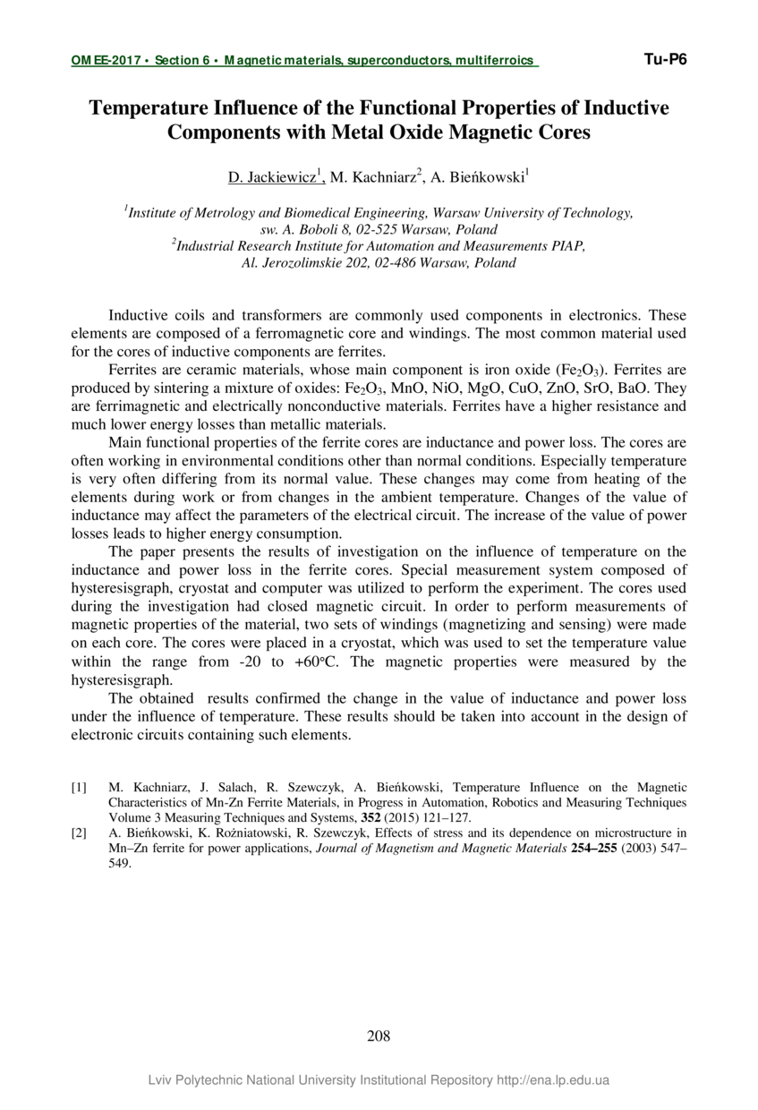 Jackiewicz D. Temperature Influence of the Functional Properties of Inductive Components withMetal Oxide Magnetic Cores / D. Jackiewicz, M. Kachniarz, A. Bieńkowski // Oxide Materials