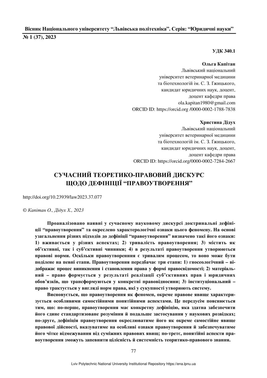 | dc.identifier.citationen | Kapitan O. Modern theoretical and legal discourse regarding the definition of “law-making” / Kapitan Olha, Didukh Khristyna // Visnyk Natsionalnoho universytetu "Lvivska politekhnika". Serie: Yurydychni nauky. — Lviv : Lviv Politechnic Publishing House, 2023. — No 1(37). — P. 77–82. | |