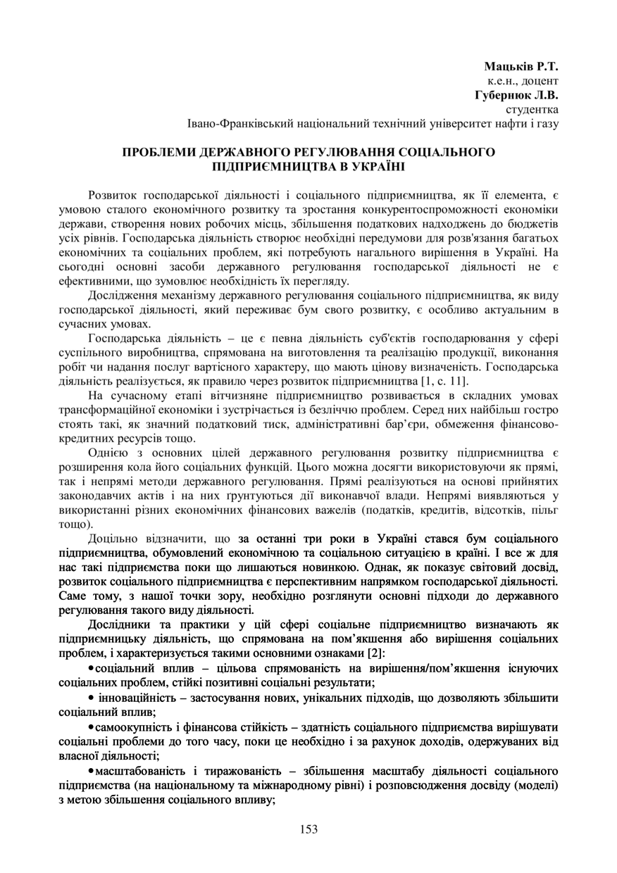 Мацьків Р. Т. Проблеми державного регулювання соціального підприємництва в Україні / Р. Т. Мацьків, Л. В. Губернюк // Економічний розвиток держави, регіонів і підприємств: проблеми та перспективи : матеріали ІІ Міжнародної науково-практичної конференції молодих учених, 18–19 травня 2017 року, Львів. — Львів : Видавництво Львівської політехніки, 2017. — С. 153–155. — (Комплексне забезпечення економічного розвитку підприємств).