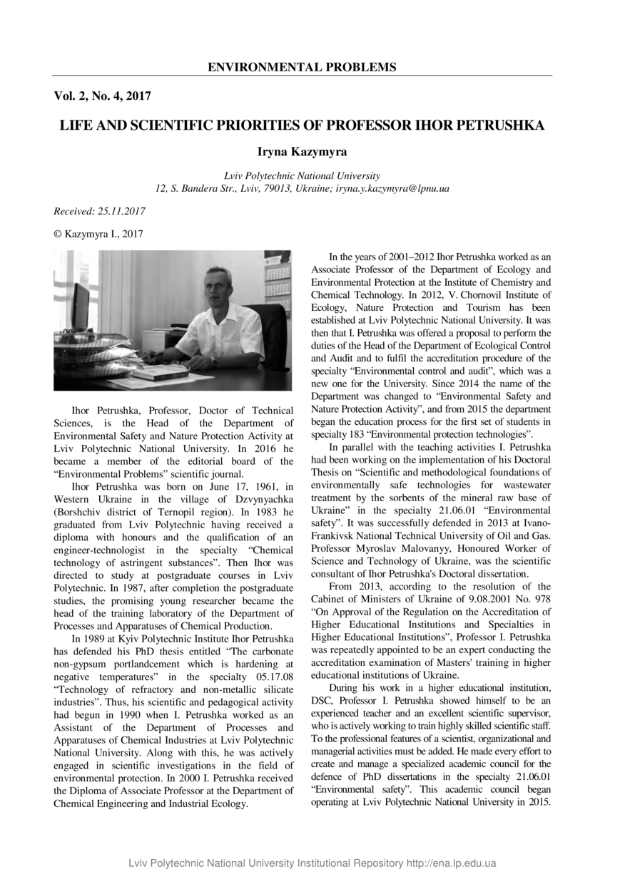 | dc.identifier.citation | Kazymyra I. Life and scientific priorities of professor Ihor Petrushka / Iryna Kazymyra // Environmental Problems. — Lviv : Lviv Politechnic Publishing House, 2017. — Vol 2. — No 4. — P. 241–244. | |