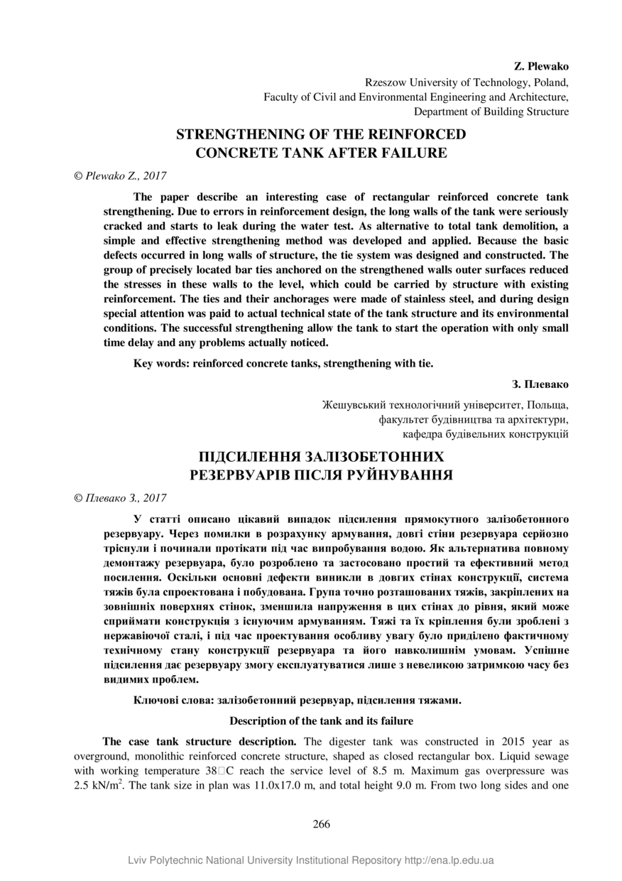 Plewako Z. Strengthening of the reinforced concrete tank after failure / Z. Plewako // Вісник національного університету “Львівська політехніка”. Серія: Теорія і практика будівництва. — Львів : Видавництво Львівської політехніки, 2017. — № 877. — С. 266–272.