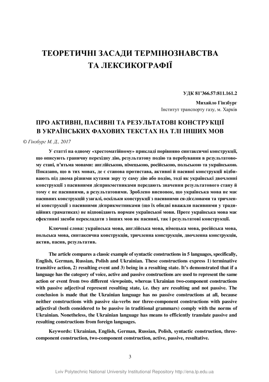 Гінзбург М. Про активні, пасивні та результатові конструкції в українських фахових текстах на тлі інших мов / Михайло Гінзбург // Вісник Національного університету «Львівська політехніка». Серія: Проблеми української термінології : збірник наукових праць. — Львів : Видавництво Львівської політехніки, 2017. — № 869. — С. 3–22.