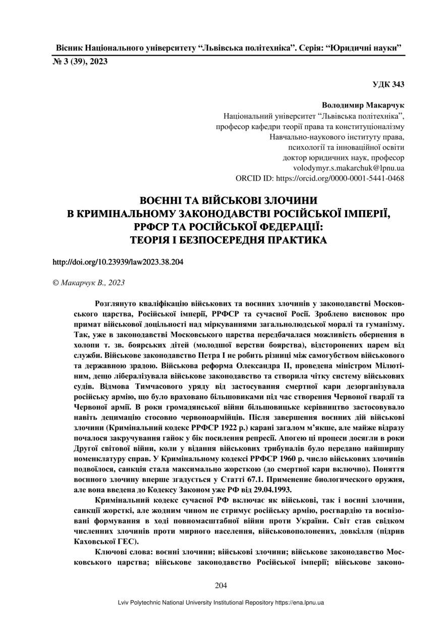 | dc.identifier.citation | Макарчук В. Воєнні та військові злочини в кримінальному законодавстві Російської імперії, РРФСР та Російської федерації: теорія і безпосередня практика / Володимир Макарчук // Вісник Національного університету “Львівська політехніка”. Серія: “Юридичні науки”. — Львів : Видавництво Львівської політехніки, 2023. — № 3 (39). — С. 204–212. | |