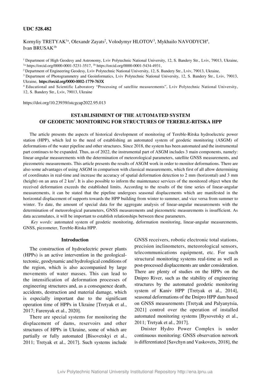 Establishment of the automated system of geodetic monitoring for structures of Tereble-Ritska HPP / Kornyliy Tretyak, Olexandr Zayats, Volodymyr Hlotov, Mykhailo Navodych, Ivan Brusak // Geodesy, Cartography and Aerial photography. — Lviv : Lviv Politechnic Publishing House, 2022. — Vol 95. — P. 13–21.