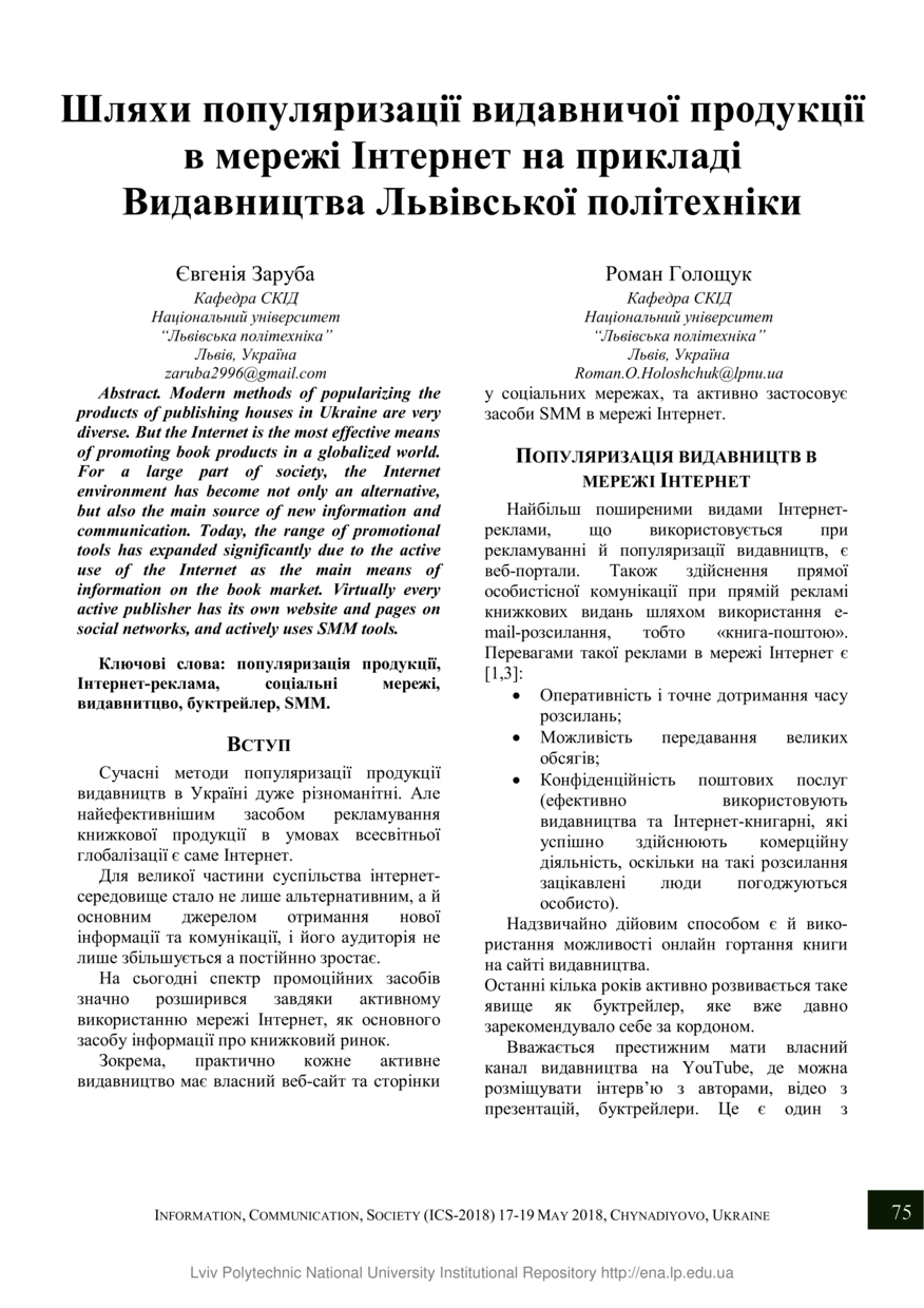 Заруба Є. Шляхи популяризації видавничої продукції в мережі Інтернет на прикладі Видавництва Львівської політехніки / Євгенія Заруба, Роман Голощук // Інформація, комунікація, суспільство : матеріали 7-ї Міжнародної наукової конференції, 17–19 травня 2018 року, Чинадієво. — Львів : Видавництво Львівської політехніки, 2018. — С. 75–76. — (Інформаційні та комунікаційні технології в Internet та World Wide Web).